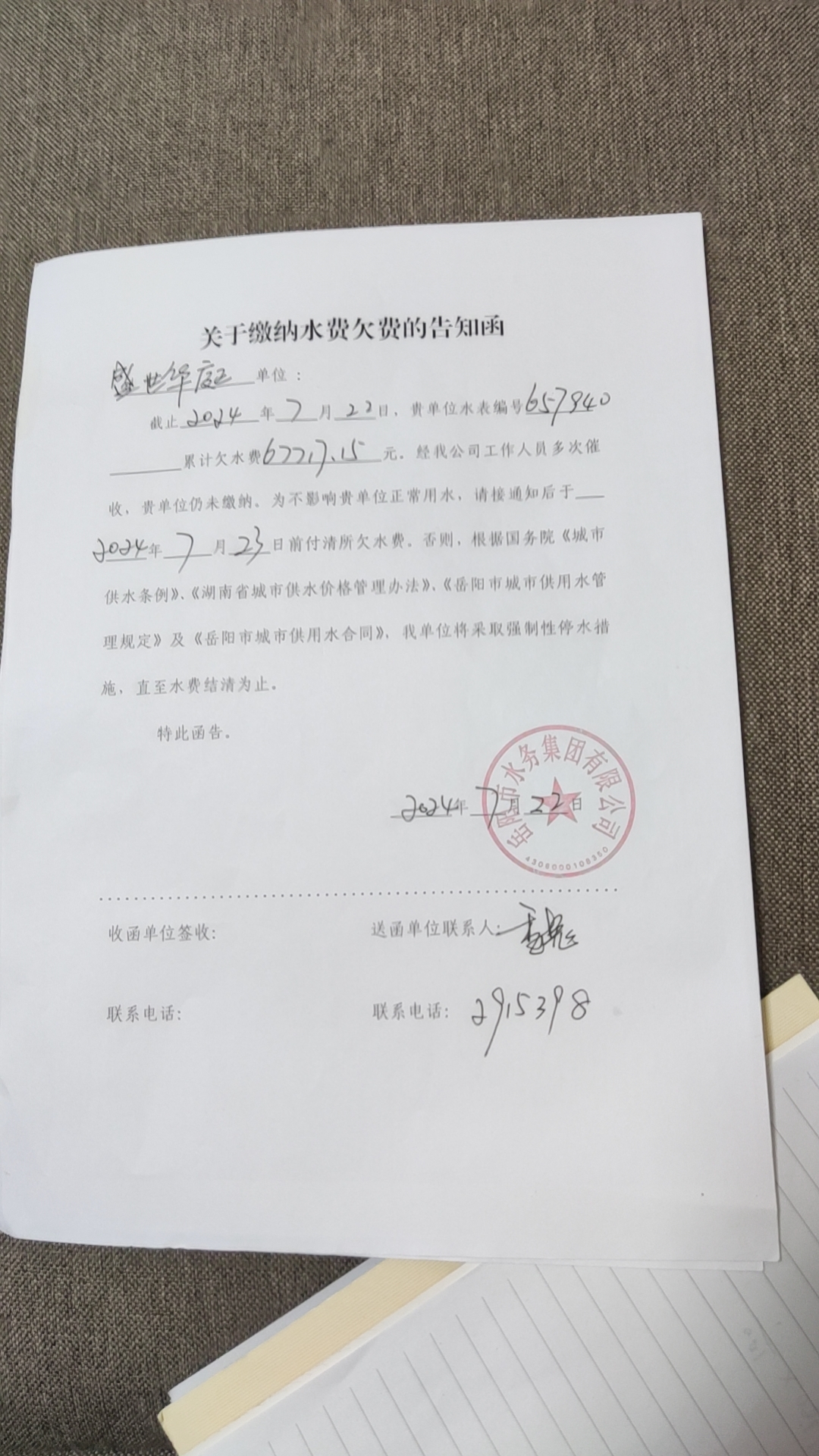 | 回复内容: | 尊敬的网友,您好!您关于《恳请领导帮忙解决盛世华庭小区水表分户问题。》的留言收悉。岳阳市人民政府12345热线服务中心将来信转交至岳阳市水务集团有限公司办公室调查处理,现就有关办理情况回复如下: 接到您的来信后,我集团城东供水分公司工作人员已与您进行电话沟通。经核实,盛世华庭小区由于物业费纠纷问题,原物业即将退场。截至2024年6月26日,贵小区累计欠缴水费达6万余元。我集团城东分公司已在贵小区张贴停水告知函,并积极与小区业委筹备委员会联系,经多次沟通协调,目前欠缴水费己缴清。 如期望实现小区内“一表一户,分表到户”用水管理,我集团需对小区内部开展供水改造,水改工程将涉及整个小区,工程量大。如确需办理分表到户相关业务,考虑到小区住户众多,建议统一意见后由社区或街道办事处牵头来我集团客户服务中心办理相关手续(地址:南湖大道421号,电话:0730-2915112)。 若您在用水时遇到任何问题,或对我们工作有任何建议或意见,请随时拨打我集团24小时客服电话2933333,我们将热忱为您服务。 岳阳市水务集团有限公司办公室 2024年7月29日 |